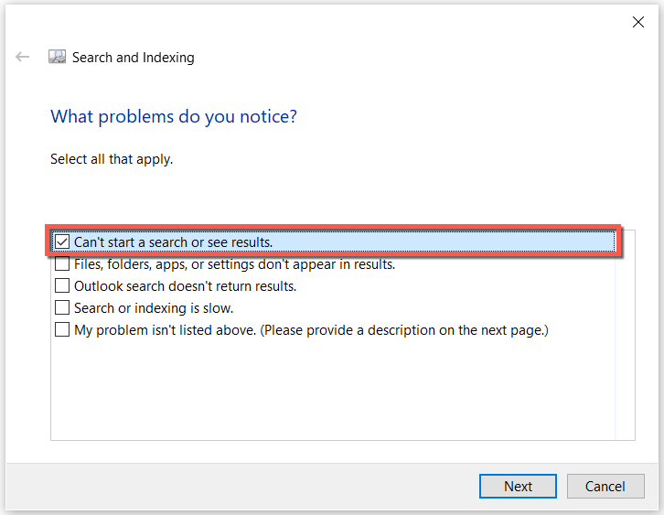 - Check the box next to Can’t start a search or see results and select Next.