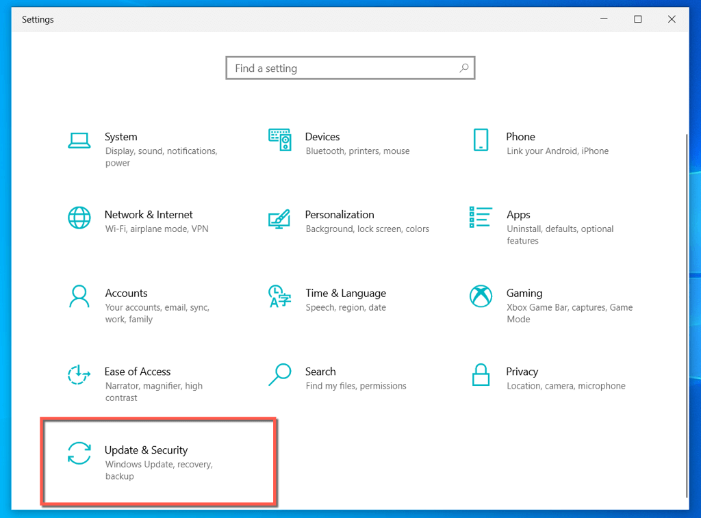 - Select the Update & Security category. In Windows, scroll down the default System screen instead.