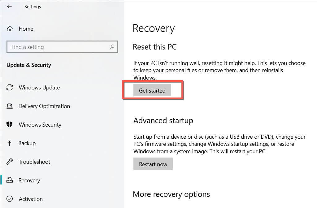 - Select Update & Security > Recovery > Get Started. In Windows 11, scroll down the System screen and select Recovery > Reset PC.