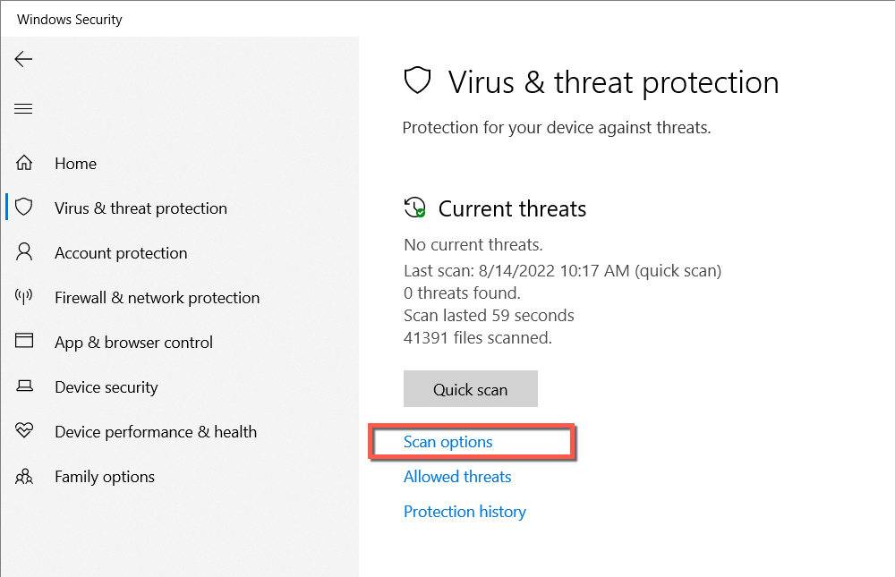 - Select Virus & threat protection > Scan options.