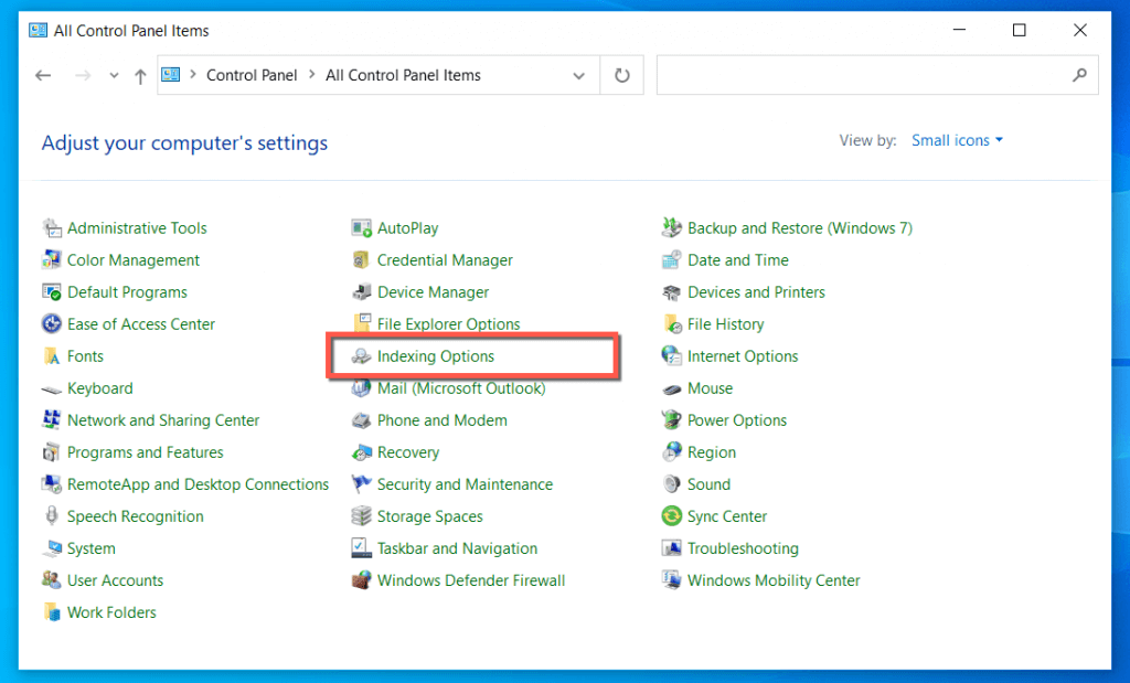 Next, rebuild the Windows Search indexing services via the Control Panel in Windows. To do that: