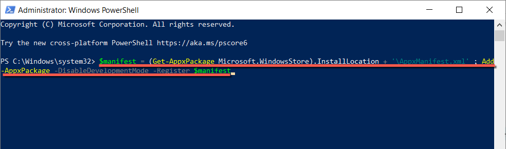 $manifest = (Get-AppxPackage Microsoft.WindowsStore).InstallLocation + ‘AppxManifest.xml‘ ; Add-AppxPackage -DisableDevelopmentMode -Register $manifest
