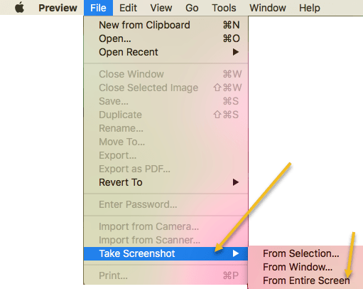 If you want to capture a screenshot in OS X with the cursor, you have to use Preview. None of the shortcut keys allow you to capture the cursor by default. Open Preview and then click on File – Take a Screenshot – From Entire Screen.