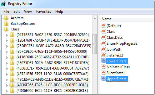 In the right pane, you should see Upper Filters and** Lower Filters**. Delete both of these and then restart the computer.