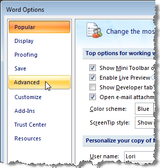 The Word Options dialog box displays. Click Advanced in the left pane.