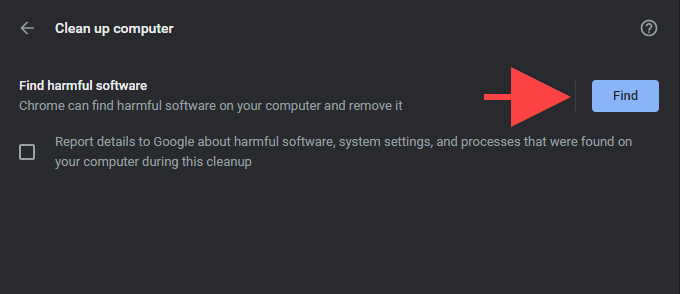 Start by selecting **Settings **on the Chrome menu. Then, select **Advanced **> Reset and clean up. Follow by selecting **Clean up computer **> Find.