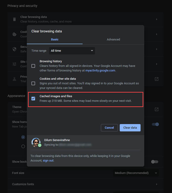 Obsolete Chrome cookies and an outdated browser cache can also prevent Chrome from working as usual. To clear them out, start by opening the **Settings **pane in Chrome. Then, select Privacy & Security > Clear browsing data and set **Time range **to All time. Follow that by checking the box next to **Cookies and other site data **and Cached images and files. Finally, select Clear data.