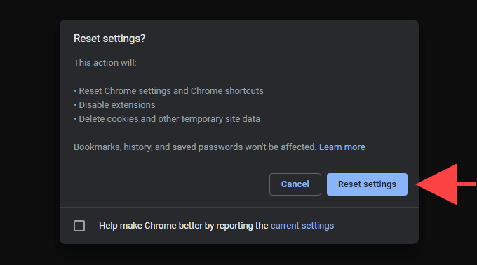 If download issues persist, try resetting Chrome. That reverts it to factory settings, but you won’t lose your bookmarks, history, or passwords.