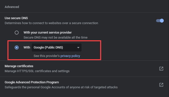 To do that, open the **Chrome **menu and select Settings. Then, select Privacy & Security > Security. Follow that by selecting the radio button next to **With **and choose Google (Public DNS), Cloudflare (1.1.1.1), or **OpenDNS **on the pull-down menu next to it.