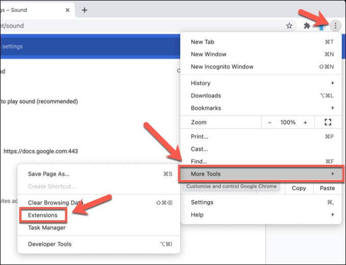 - To do this, select the three-dots menu icon in the top-right. From the menu, select More Tools > Extensions.