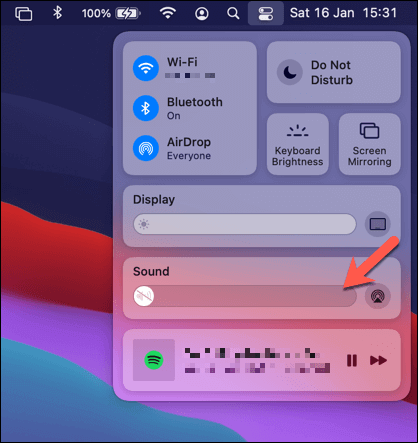 - For Mac users, system volume applies to all running apps. To access the volume controls (for macOS Big Sur and newer), select the **notifications icon** on the menu bar. From the drop-down menu, move the **Sound slider** to 100% by moving it all the way to the right.