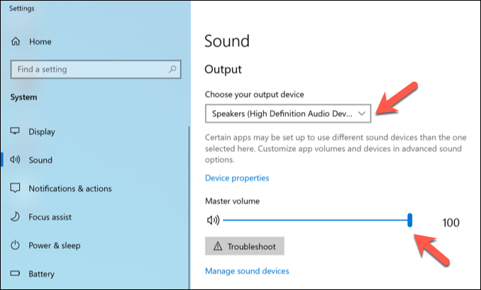 - In the **Sound Settings menu**, select the correct output device (eg. your speakers) from the **Choose your output device** drop-down menu. Once selected, make sure the **Master volume **slider is at **100** by moving the slider to the right.