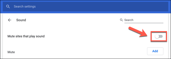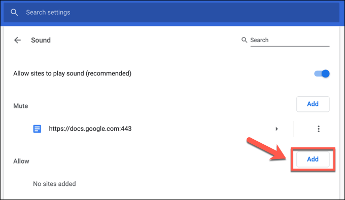 - In the **Chrome Sound settings menu**, make sure that the **Allow sites to play sound (recommended)** slider is enabled. When disabled, the option is labelled as **Mute sites that play sound**.