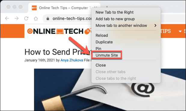 - If you want to unmute the page, right-click the tab at the top of the Chrome window. From the drop-down menu, select the **Unmute Site **option.