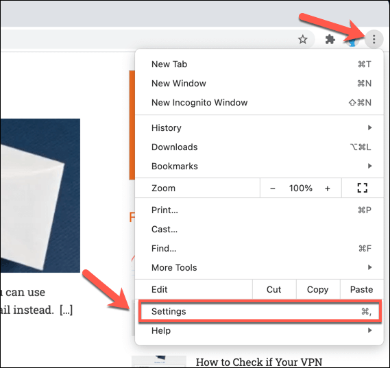 - To do this, you’ll need to access the Chrome settings menu. In Chrome, select the **three-dots menu icon **in the top-left, then select Settings from the options menu.
