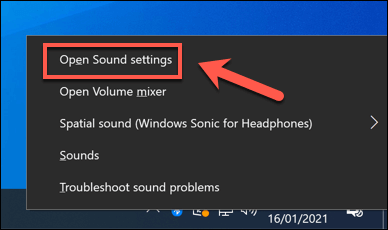 - To do this on Windows, right-click the **sound system tray icon **in the bottom-right corner of the taskbar. From the menu, select the **Open Sound settings **option.