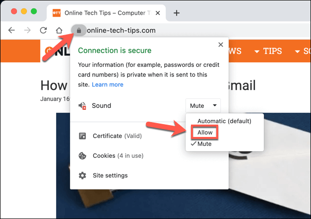 - Alternatively, select the** lock icon**, to the left of the URL on the address bar. From the drop-down menu, change the **Sound** option to **Allow**.