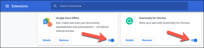 - Once you’ve disabled all extensions, restart Chrome and check your output. If audio is restored, return to the **Extensions** menu and re-enable each extension, one by one, checking that sound output isn’t affected. If re-enabling an extension causes the audio to stop, disable and remove that extension.