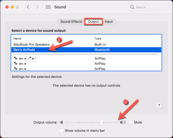 - In the **System Preferences** menu, select **Sound > Output**. From the options available, select the correct output device. Once changed, make sure the **Output volume **slider at the bottom is moved **right** for maximum volume.