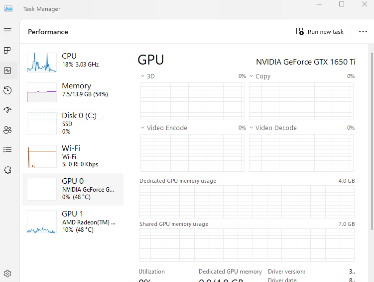 - Switch to the Performance tab (the third tab on the left). This lists the performance of the main components of your PC, from the Processor to the Memory and of course, the GPU.