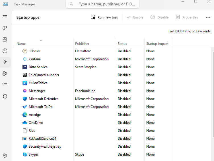 Some apps might also be starting up without your knowledge and running in the background. You can disable these by switching to the Startup tab and unchecking the option. You can also remove some of them with a dedicated bloatware removal tool.