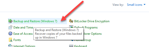 Click on Backup and Restore (Windows 7). Make sure to change the view to Small or Large icons in order to see the list of items.