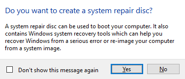 Once the backup is complete, you will be asked if you want to create a system repair disc. I highly recommend that you do this immediately as you’ll need it in order to restore the PC in case something goes wrong.