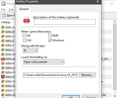In the new window that appears, give the hotkey a name. After, choose what combination you’d like to trigger the shortcut. For example, I chose to do Windows+F2. After, you can click the** Browse **option to find the location of the executable you’d like to open.
