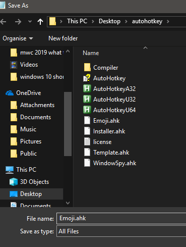 Now, click** File in Notepad, then click Save as. Navigate to the directory you extracted Autohotkey. Next, **click the **Save as type **drop down box and select **All files. **Now, name it Emoji.ahk and click Save.