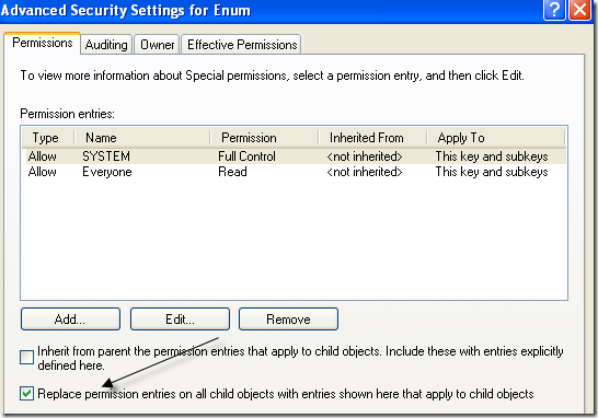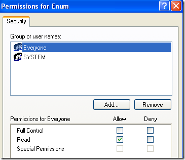 Now right-click on Enum and choose Permissions. If the Group or user names list box is empty, then you know this is the problem! It should have two names in there, System and Everyone.
