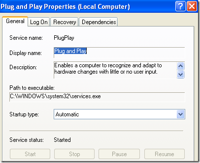 Scroll down and find the Plug and Play service. Double-click on it and make sure the Startup type is set to Automatic and click Start if the service is not running.
