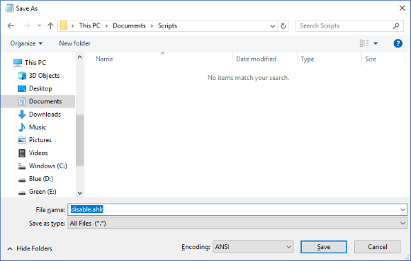 In this example, we’ve chosen the “Scripts” folder within our Documents. After you choose a location to save it, change the “Save as type” to “All Files”. Then, type in a filename of your choice and be sure to append the “.ahk” extension. This is very important.