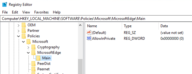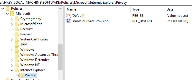 With those settings configured, users should not be able to use InPrivate browsing in IE and Edge anymore. Next, let’s talk about the registry keys if you cannot use gpedit. ## Disable InPrivate Browsing via Registry