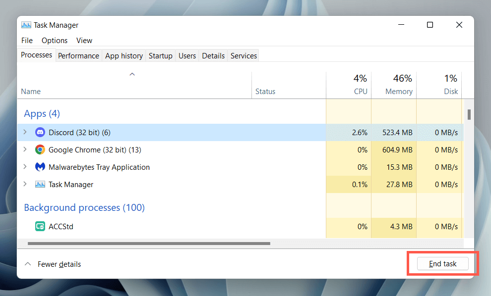 - Under the Processes tab, select Discord > End task.