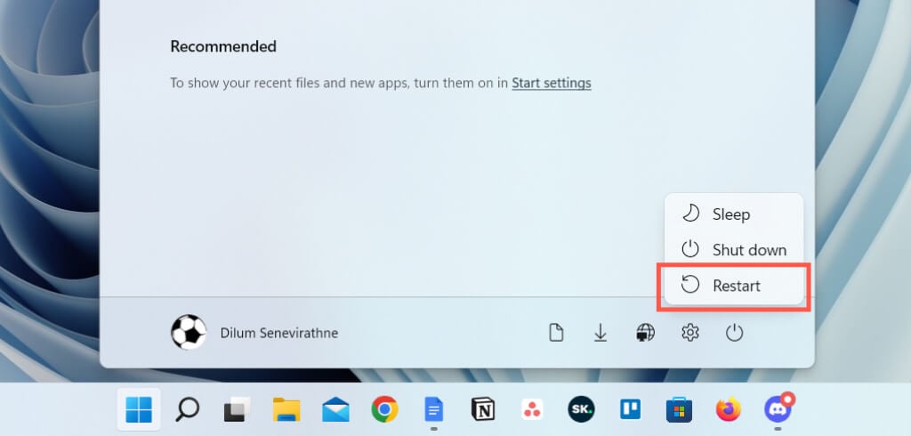 If you rarely restart your computer, expect all sorts of problems to crop up in Windows and the applications that run on it. Open the Start menu and select Power > Restart if you haven’t already.