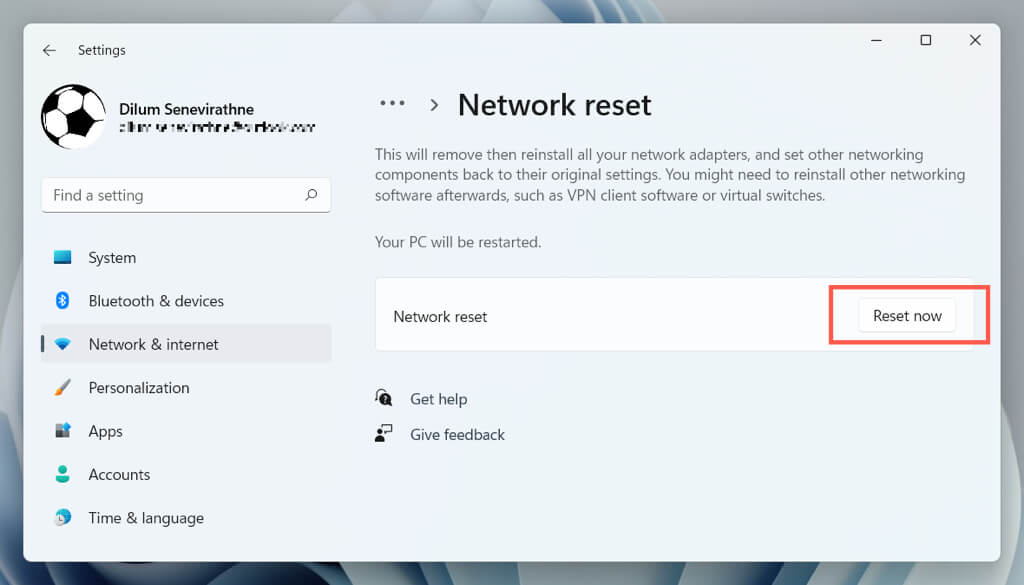 The reset procedure will restart Windows and reinstall all network drivers and Wi-Fi/Ethernet adapters. You must rejoin any Wi-Fi networks manually after the reset.
