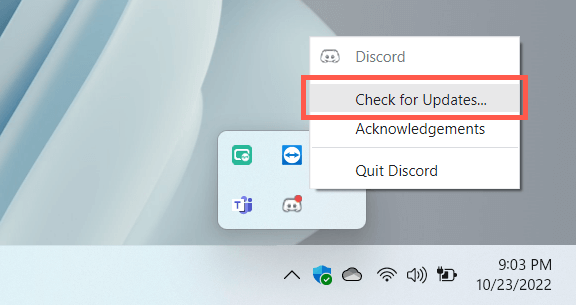 Discord publishes frequent updates that address connectivity issues with the program. To install them, right-click the Discord icon on the system tray (bottom right of the screen) and select Check for Updates.