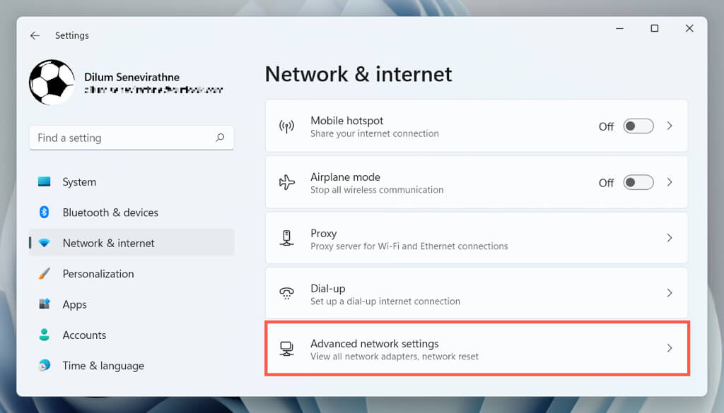 - Open the Windows Settings app and select Network & internet > Advanced network settings.