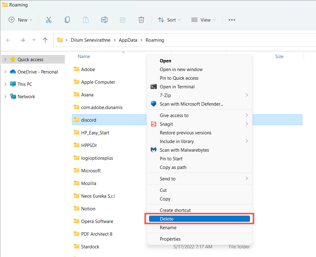 - Right-click the discord folder and select Delete.