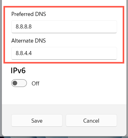 Next, switch the Domain Name System for your network connection to Google DNS to increase Discord’s chances of locating the best servers. To do that: