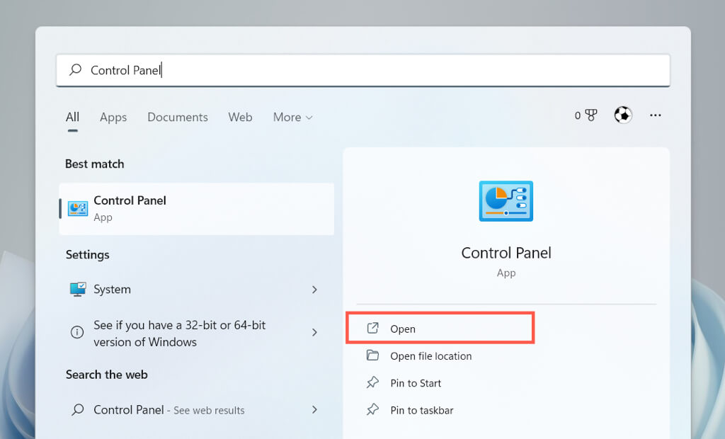 - Open the Start menu, search for the Control Panel, and select Open.