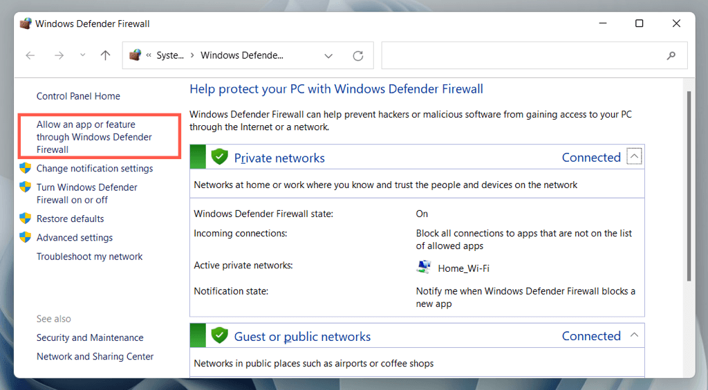If Discord struggles to connect over a particular network, visit the Windows Defender Firewall and provide the application unrestricted access to the internet. To do that: