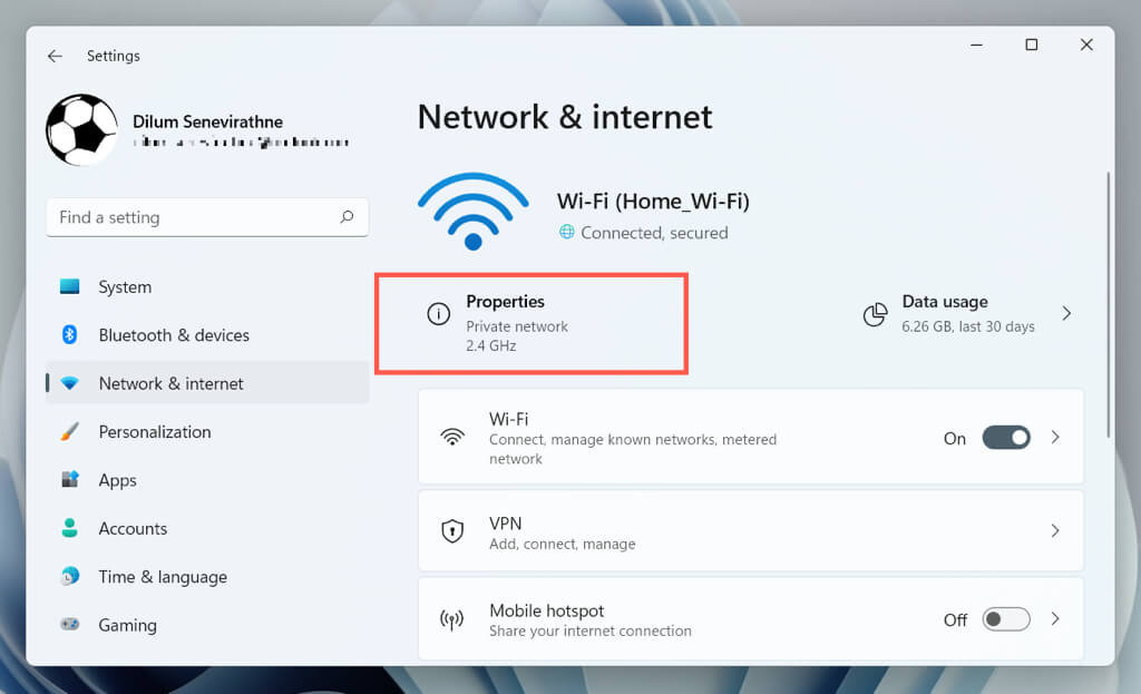 - Select Network & internet and choose Properties next to Wi-Fi or Ethernet.