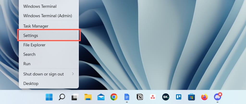 - Right-click the Start button and select Settings.
