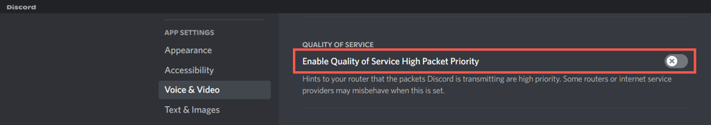 Discord has a feature that marks voice calls with a high priority, which means that your router then gives it preference over other forms of data. However, it doesn’t work well on some network configurations. To disable the feature: