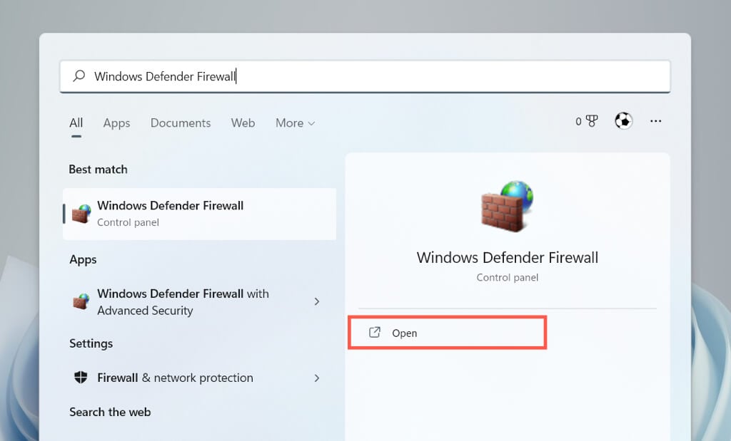 - Open the Start menu, search for Windows Defender Firewall, and select Open.