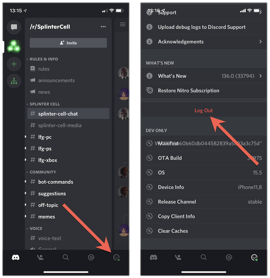 Signing out and back into Discord often prompts the app to download stuck messages again. To do that, select the Profile/Settings icon at the bottom of the screen and select Log Out.