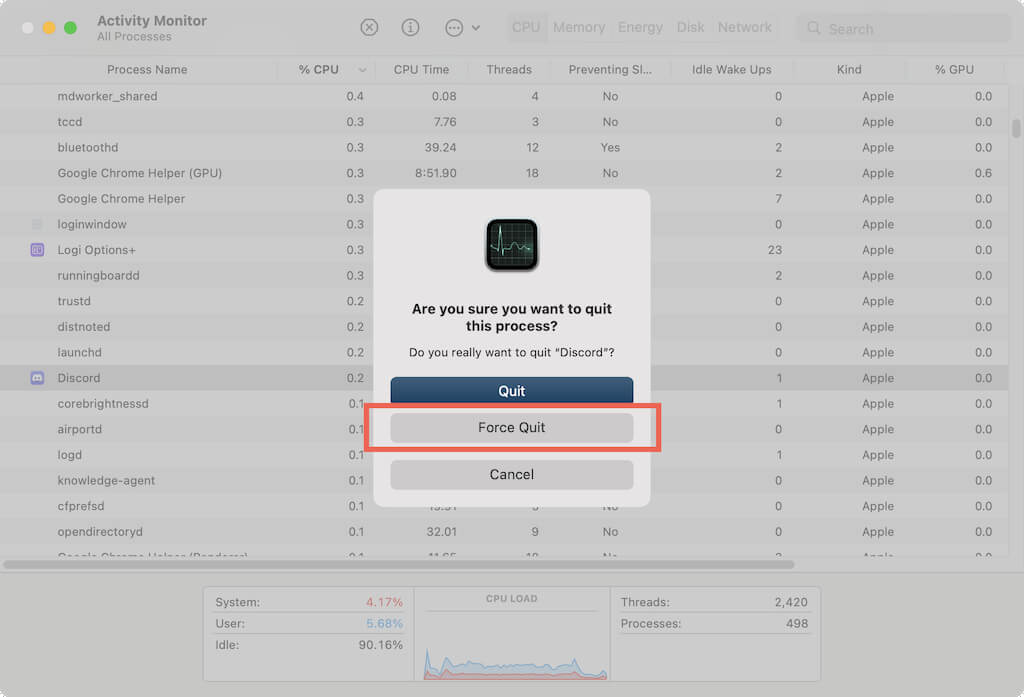 - Mac: Open the Launchpad and select Other > Activity Monitor. Then, locate and stop all Discord processes.