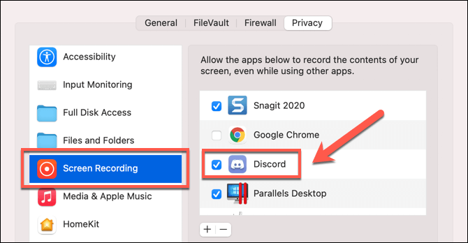 - In the **System Preferences** menu, select **Security & Privacy **>** Privacy **>** Screen Recording**. You may need to unlock access by selecting the **Click the lock to make changes** option beneath, then authenticating using your password or with Touch ID. Once unlocked, make sure to select the checkbox for **Discord** to allow it to read and record your screen, then restart the Discord app afterwards.