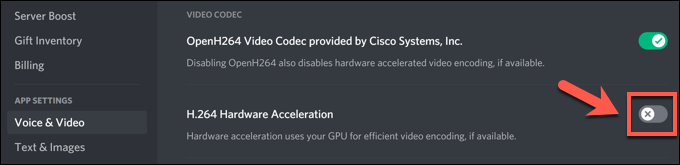 - Select **Voice & Video **in the **Discord Settings menu**. From there, select the **H.264 Hardware Acceleration** slider, switching it to the **Off** position.